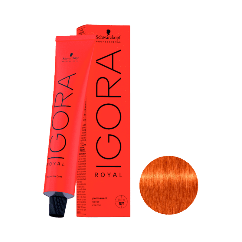 Cabelos com cor louro claro cobre extra, vibrante e uniforme. A fórmula da Igora Royal proporciona brilho, suavidade ao toque e aspecto saudável, destacando a beleza dos fios com um acabamento profissional e elegante.